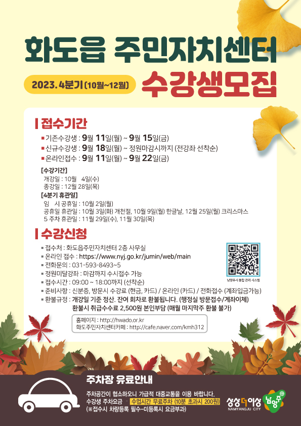 2023년 4분기(10월~12월) 화도주민자치센터 프로그램 수강생모집안내4 0 |