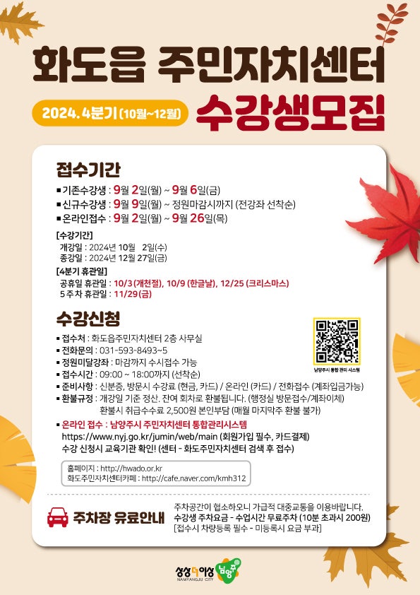 [프로그램안내] 2024년 4분기(10월~12월) 화도읍주민자치센터 프로그램 수강생모집안내 |